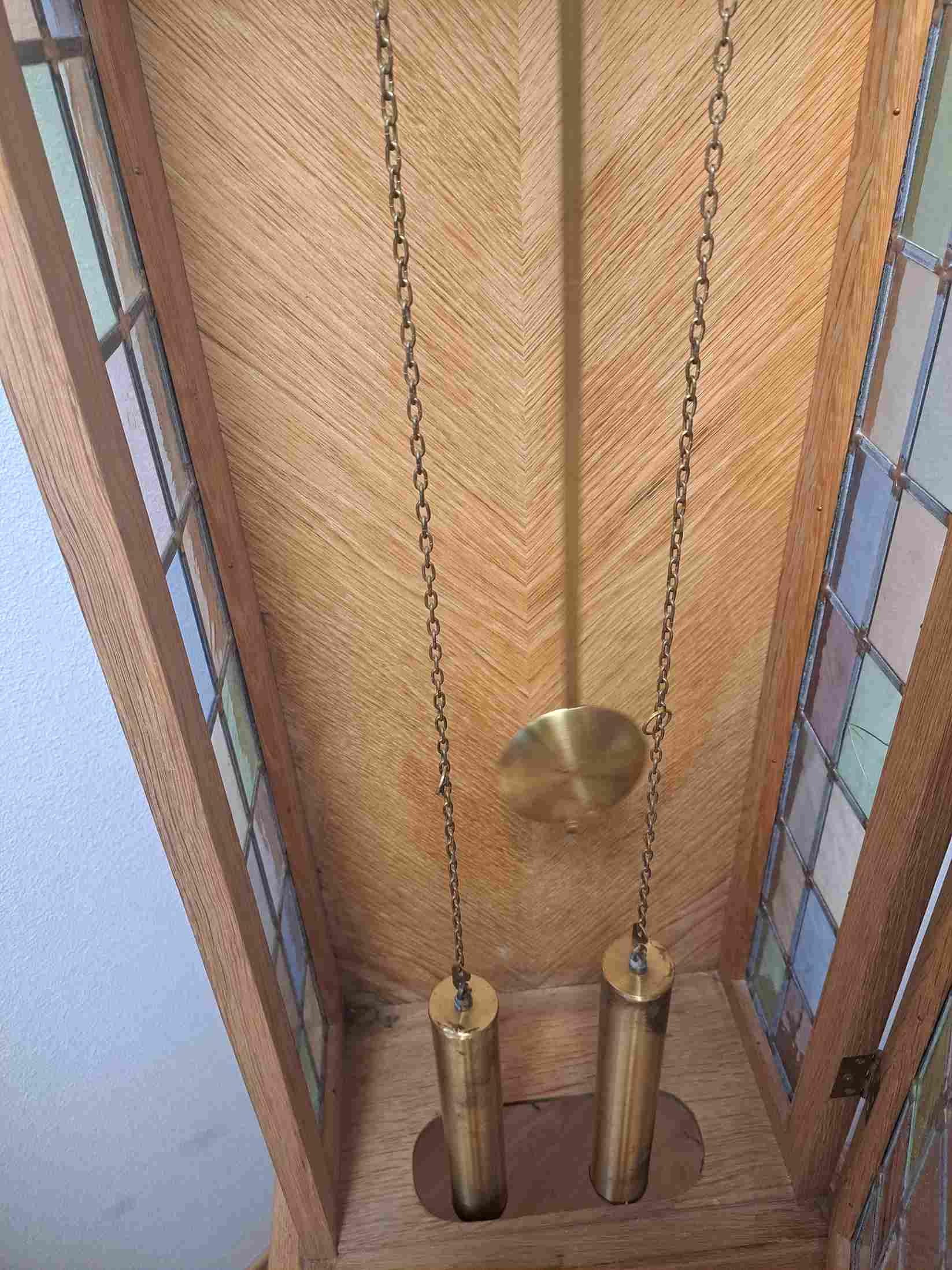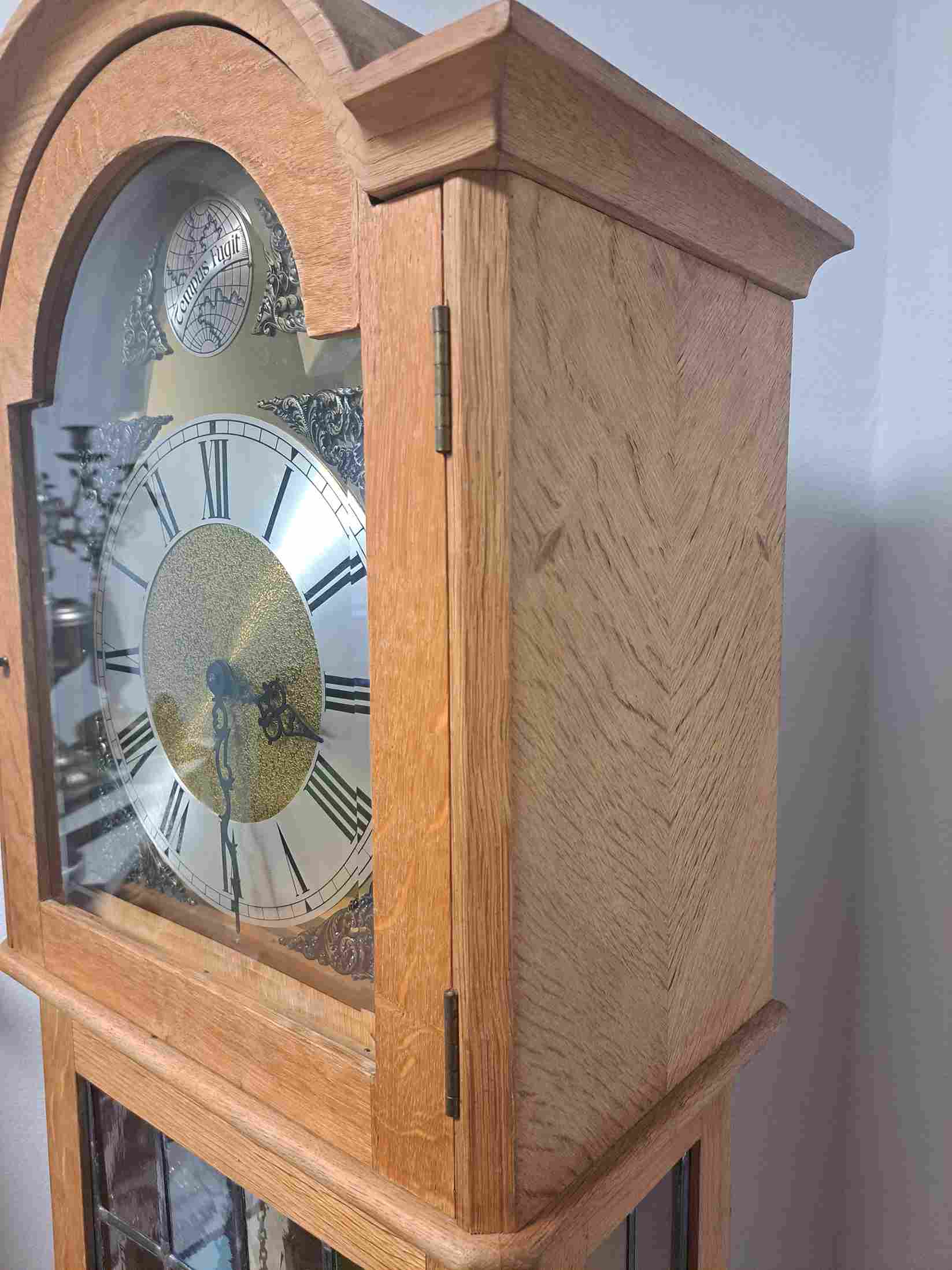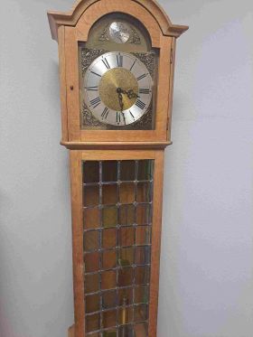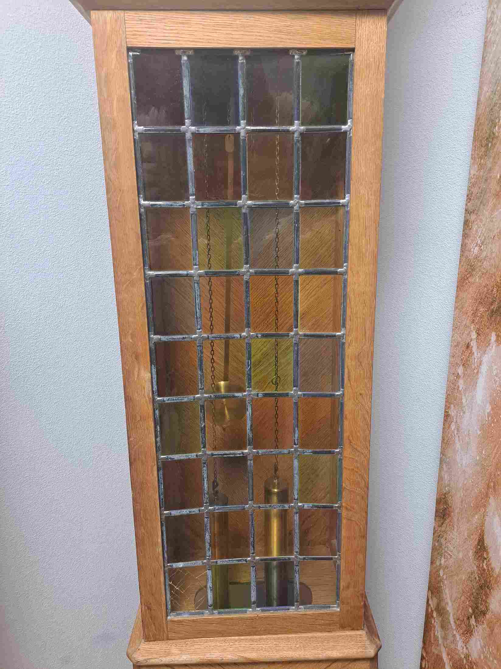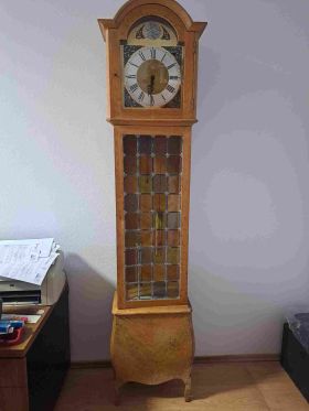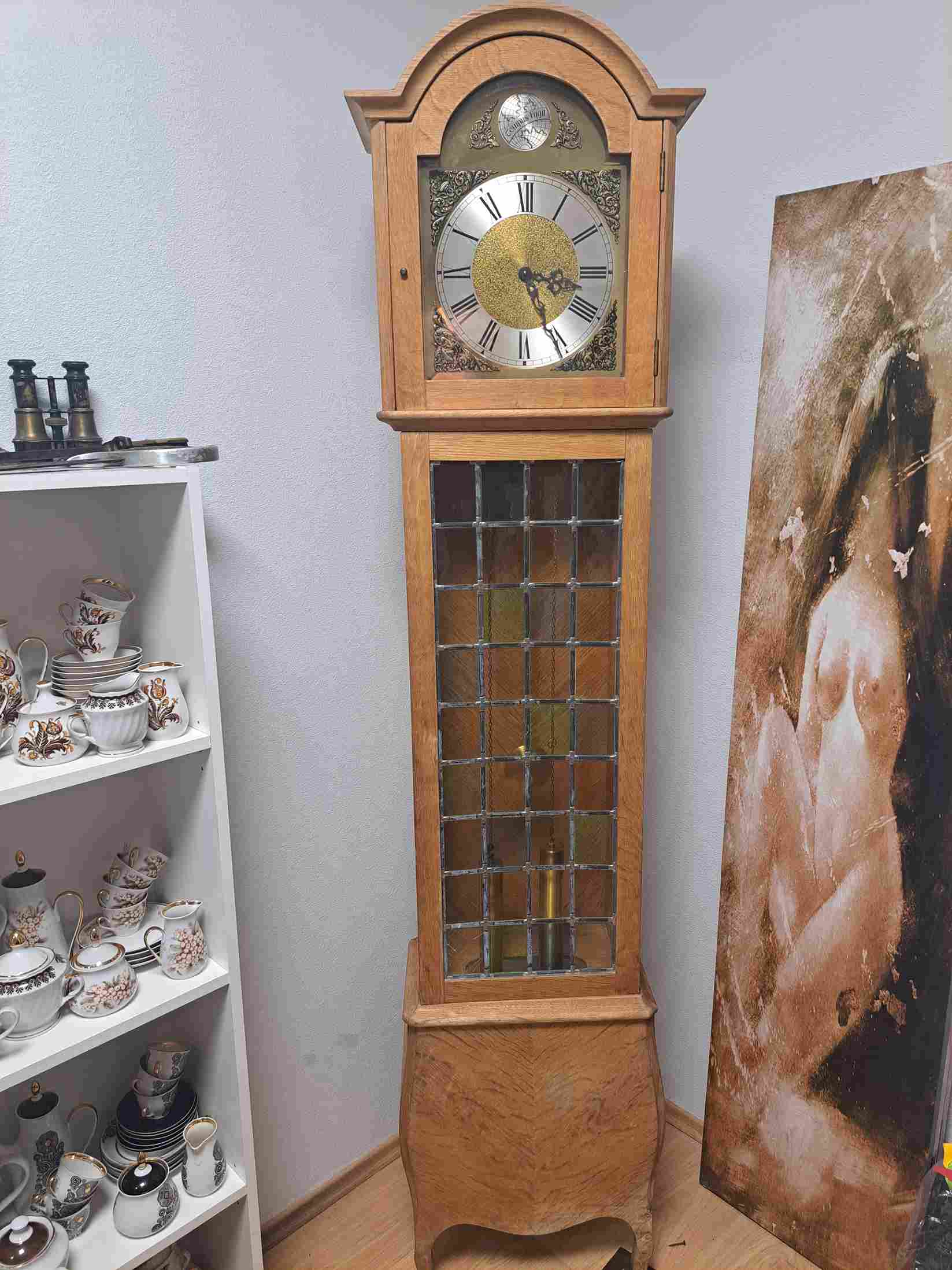 Skaists vācu ražotāja grīdas pulkstenis. Ideāli piemērots kā dāvana vai interjera elements, ar ļoti melodisku zvanu. Mehānisms ar ķēdes piekari un diviem atsvariem. Augstums – 1,85 m.
